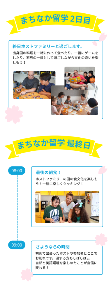 | 解散場所 | 各ホストファミリー宅 ※実施から約3日前に詳細をお送りいたします。 ホストファミリー宅は東京都内または神奈川県内です。 |