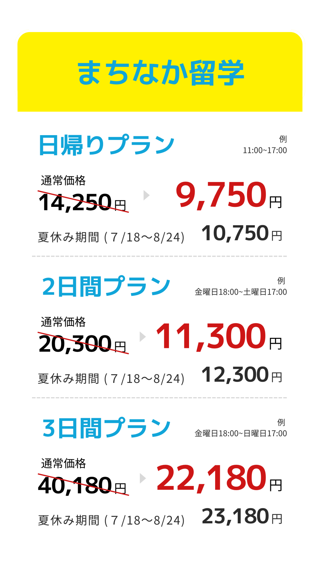 ※セットプラン分のプラス料金はまちなか留学のお申込み完了後にご案内いたします。