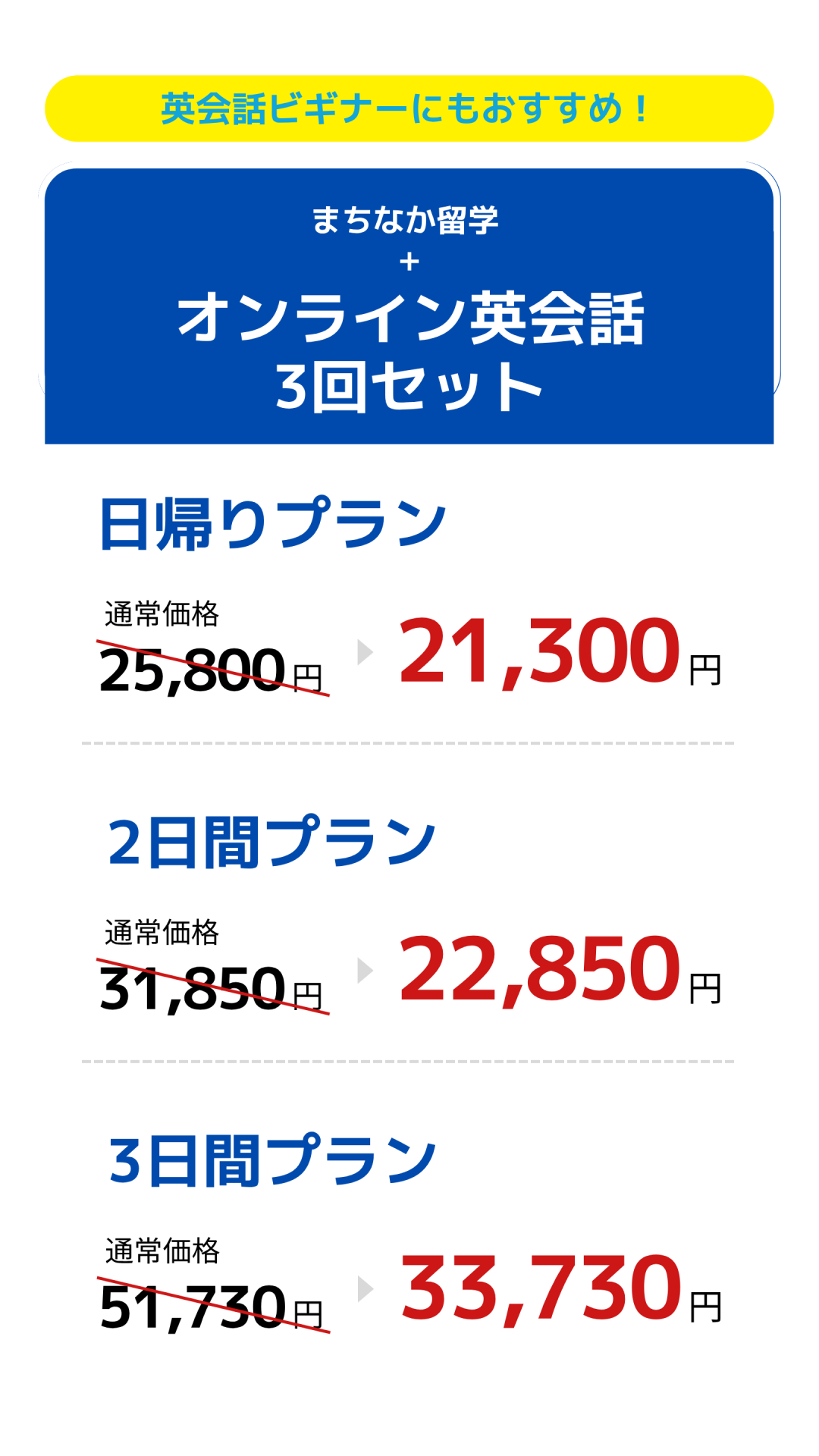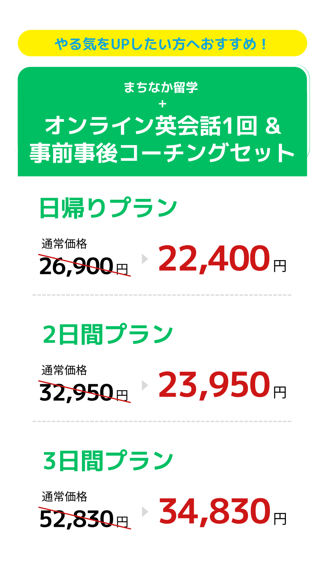 ※まちなか留学単体でのお申込みは可能ですが、英会話などのオンラインレッスン単体ではお申込みいただけません。