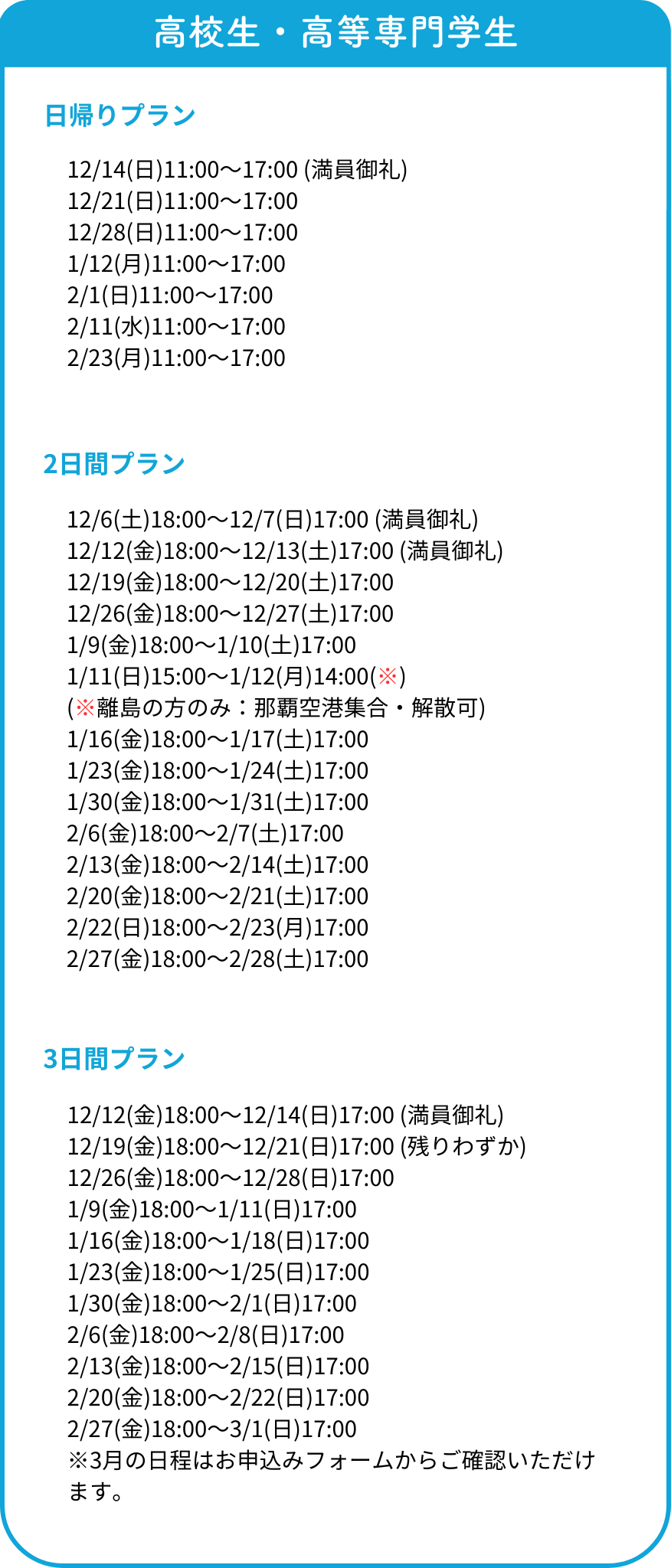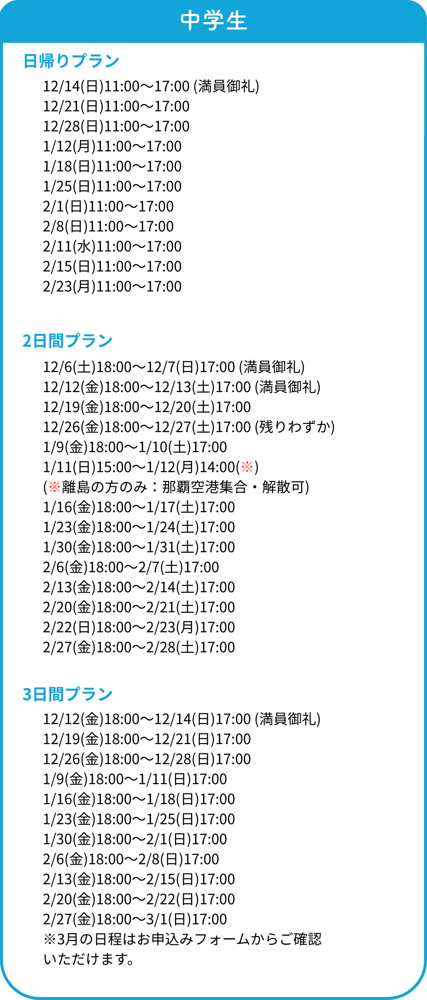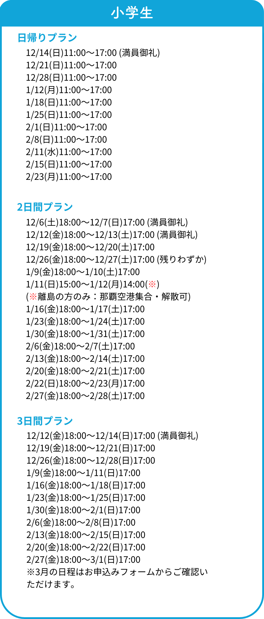 ※家庭の都合で参加費が捻出できない場合は、一定の要件(要保護・準要保護世帯など)をクリアした場合、日帰りプランの支援制度がありますので、公式LINEまでお問い合わせください。