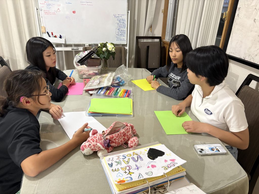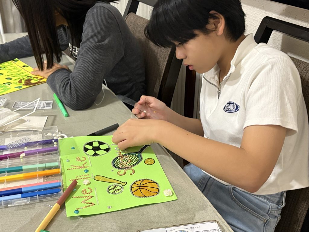 お菓子作りの後は、英語のアートプロジェクトに挑戦!ホストファミリーからどんな英語がいいかアドバイスをもらいながら思い出の作品を作りました。