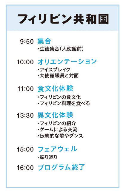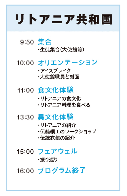大使館によって体験内容・時間が異なります。また、スケジュールは変更になる場合がありますので、参考としてご覧ください。