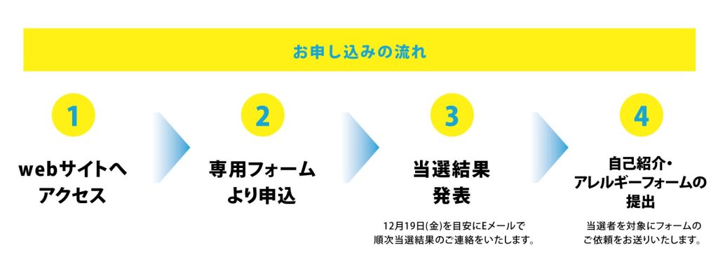 12月19日(金)の当選者発表後、自己紹介・アレルギーフォームの提出をお願いします。