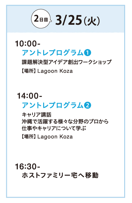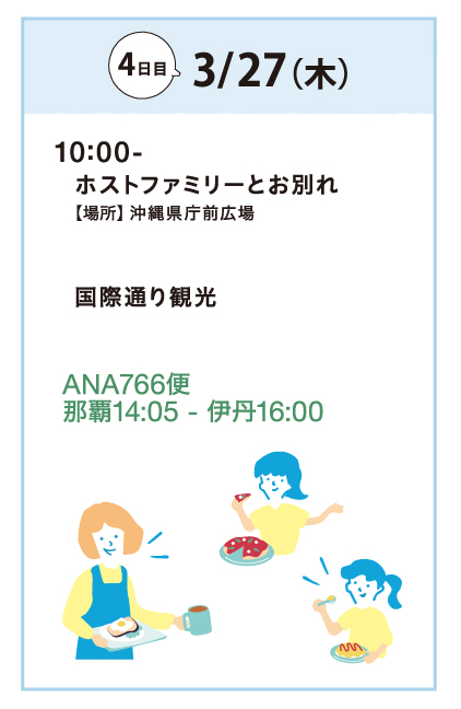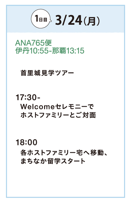 | 参加費用 | →50,000円(税込) ※補助額が増え、参加費用に変更がありました。(2025年2月21日時点) ※プログラム費用・滞在費・航空券代が含まれています。 ※全日程の昼食費、首里城ツアー料金、那覇空港⇄ホストファミリーとの集合・解散場所までの交通費は別途自己負担です。 |